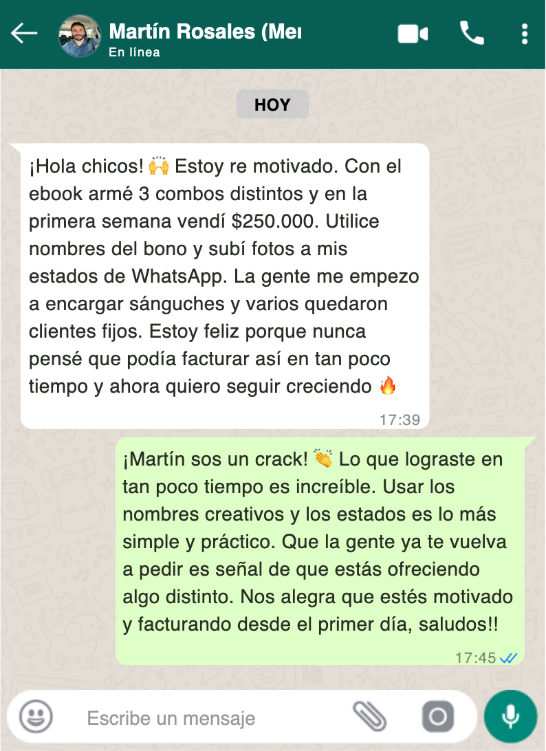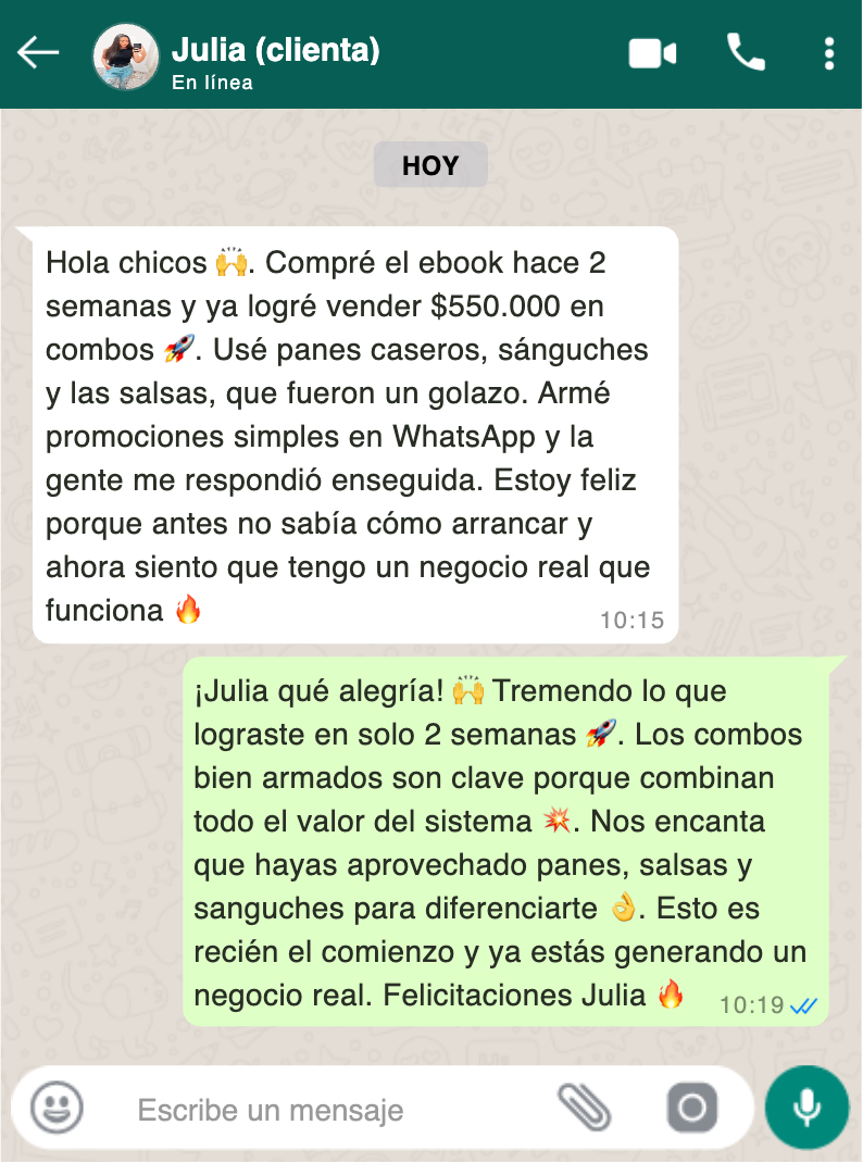 "Muy bueno todo! 😊 Arranqué hace 2 meses y ya vendo $450.000 por mes. Armé 3 combos fijos y me funciona re bien. Todos mis conocidos me recomiendan 💪"
