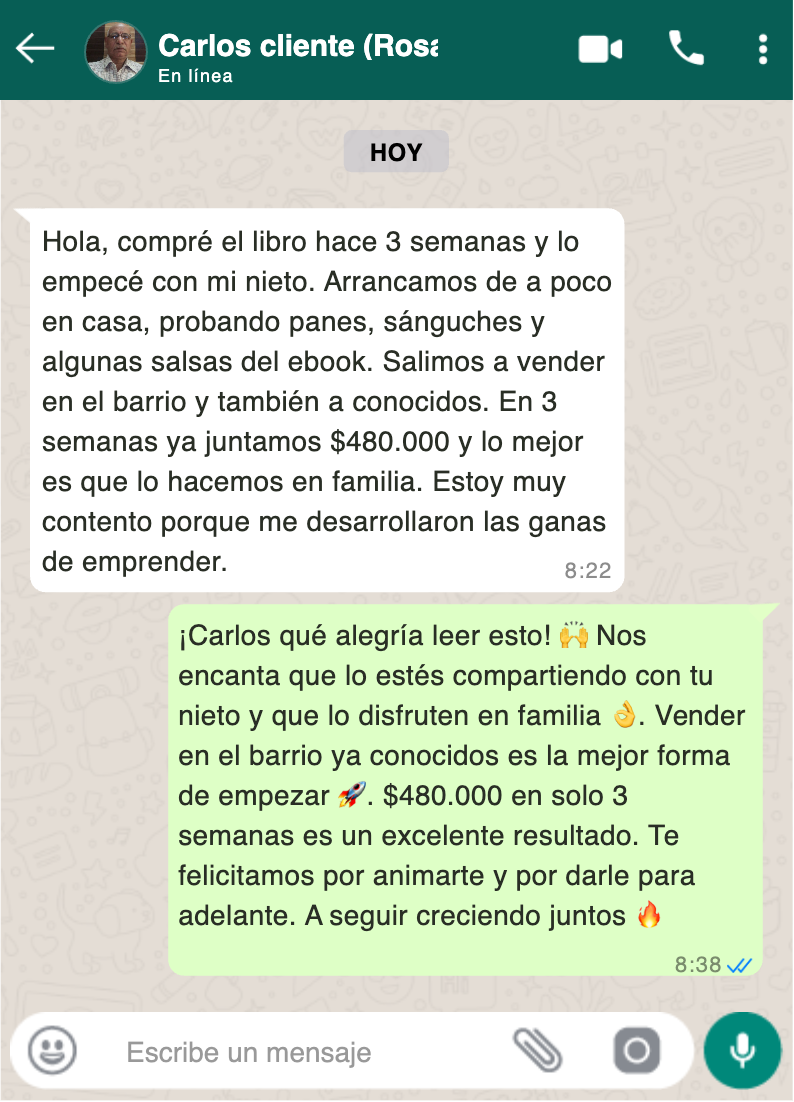 "Recién empiezo pero muy contento. Las recetas son claras y ya tengo 8 clientes fijos. Vendo todo por WhatsApp."